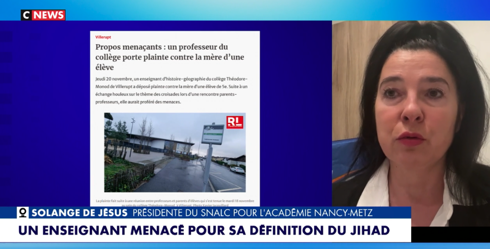 Je le disais, être enseignant, être professeur, aujourd’hui, en 2025, c’est un véritable sacerdoce, il faut vraiment le vouloir avec une nouvelle affaire. On va saluer Solange De Jésus, qui est présidente du SNALC pour l’Académie de Nancy-Metz, le Syndicat national des lycées, collèges, écoles et du supérieur. Bonsoir Solange De Jésus, merci d’avoir accepté notre invitation. Je voulais absolument vous avoir parce qu’on va rappeler très rapidement, c’est l’histoire d’un professeur d’histoire-géographie qui est menacé dans une petite commune en Meurthe-et-Moselle. Et tout ça, pourquoi ? Parce que la mère d’un élève a estimé qu’il aurait stigmatisé, c’est bien cela, l’islam, les musulmans, lors d’un cours tout simple sur les croisades. On en est là, ma chère Solange De Jésus ?