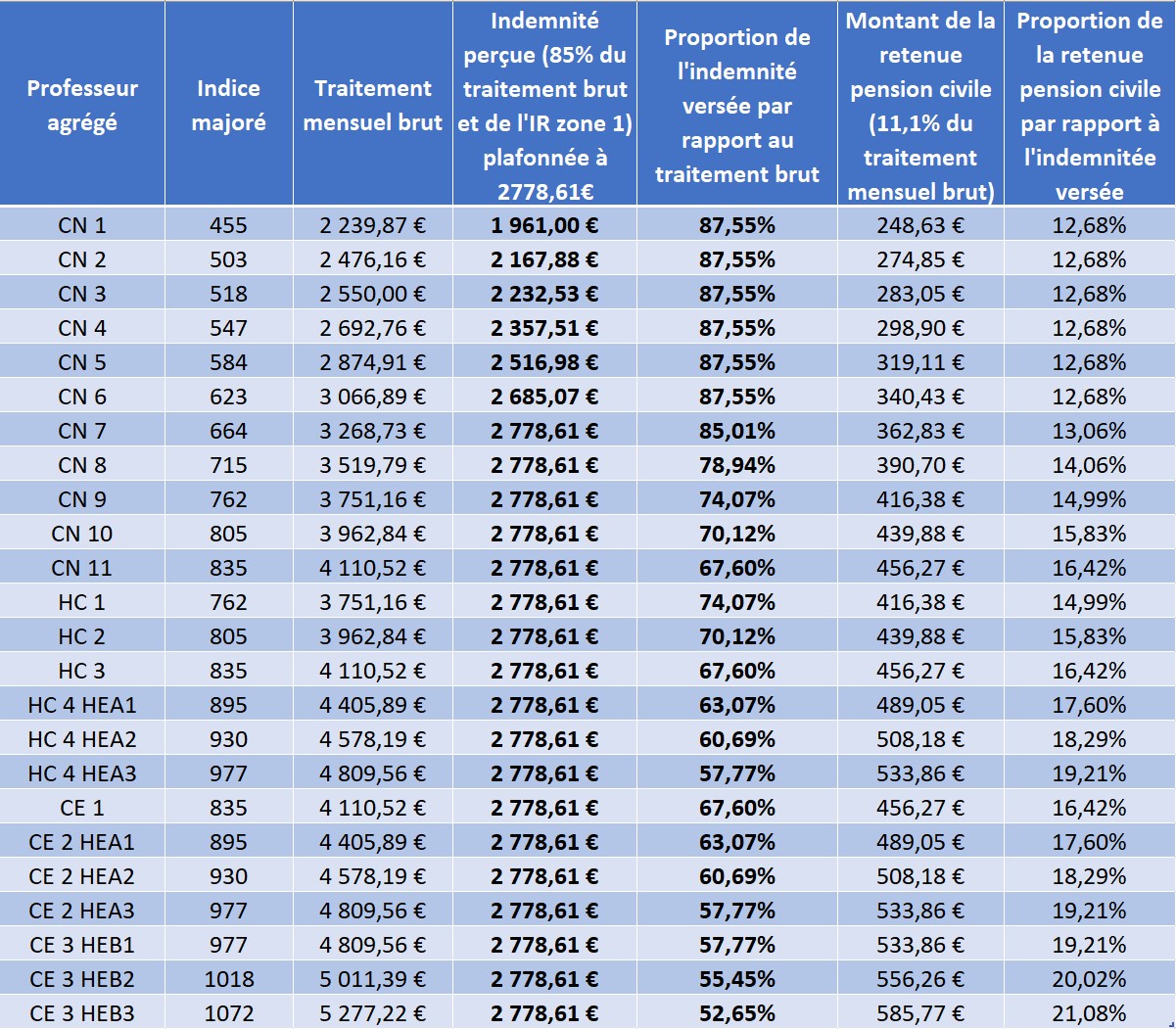 Le tableau indique l’indemnité forfaitaire de congé de formation professionnel et la part réelle du traitement brut qu’elle représente, ainsi que le montant de la cotisation retraite (retenue pension civile) et la part qu’elle représente par rapport au montant de l’indemnité.