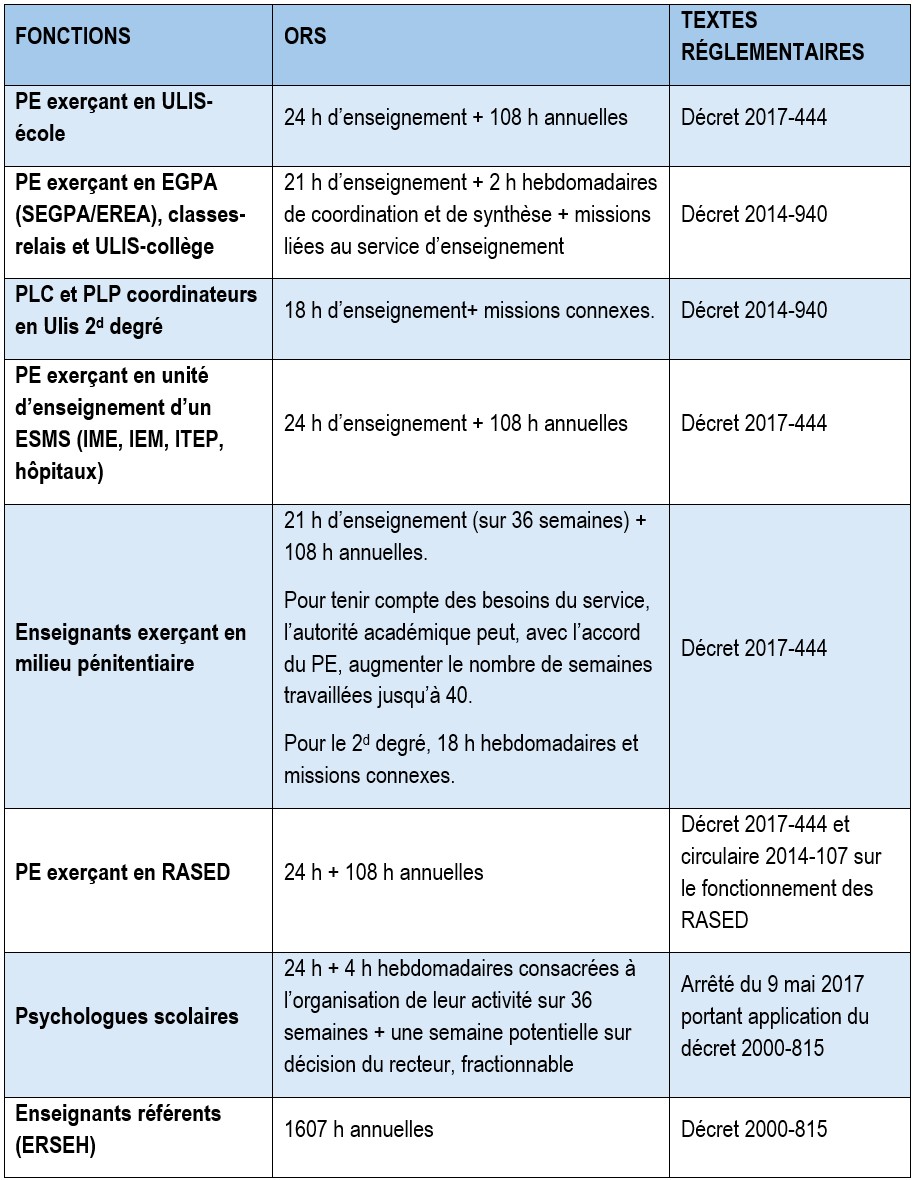 Les obligations réglementaires de service (ORS) dans l’enseignement spécialisé ne sont pas toujours connues, y compris par la hiérarchie. Il existe des différences qui tiennent à la fois aux profils des élèves et au niveau d’enseignement (premier ou second degré).