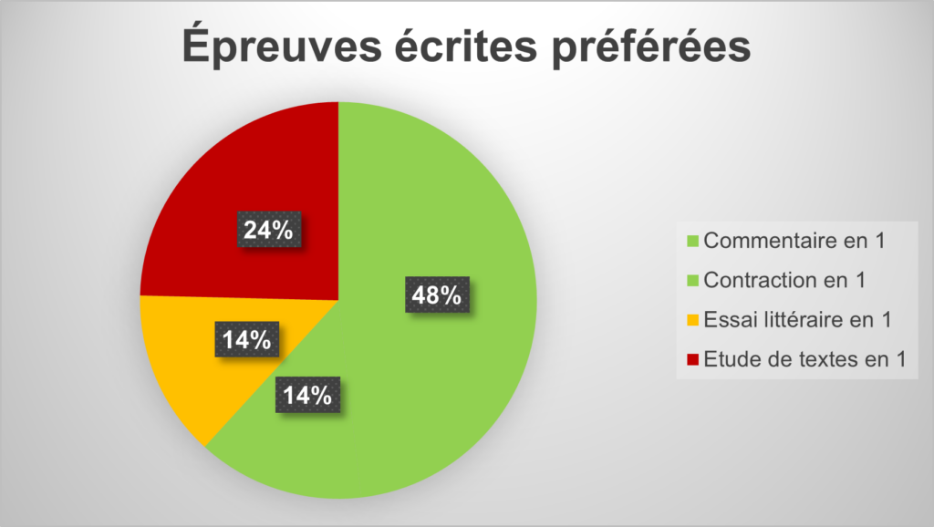 En revanche, les résultats sont plus clairs concernant l’autre partie de l’épreuve écrite. Le SNALC a demandé aux professeurs de classer quatre propositions. Le commentaire arrive en tête pour environ la moitié des répondants à notre enquête. Le SNALC préconise donc de ne pas toucher à cette partie de l’épreuve, que ce soit dans la voie générale ou dans la voie technologique.