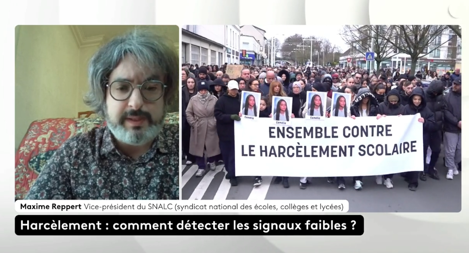 Dans un entretien diffusé le 25 janvier 2026 sur Franceinfo, Maxime Reppert, vice-président du SNALC, décrypte les limites des dispositifs actuels de lutte contre le harcèlement scolaire et appelle à une politique nationale dotée de moyens humains, financiers et de formations adaptées — notamment en santé mentale — pour protéger élèves et personnels.