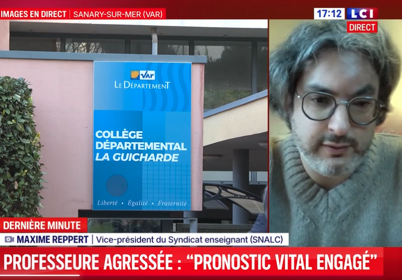 […] Je m’arrête encore sur cette idée de « plus tranquille nulle part ». Vous êtes toujours avec nous, Maxime Reppert, vice-président du Syndicat national des enseignants — et je vous remercie d’ailleurs d’être toujours avec nous. Vous disiez au tout début de cette émission, de cette édition spéciale : « Il n’y a plus de collège tranquille. » C’est le constat que vous faites tous aujourd’hui. Il n’y a plus un endroit, un collège, un établissement en France qui se sente en sécurité désormais ?