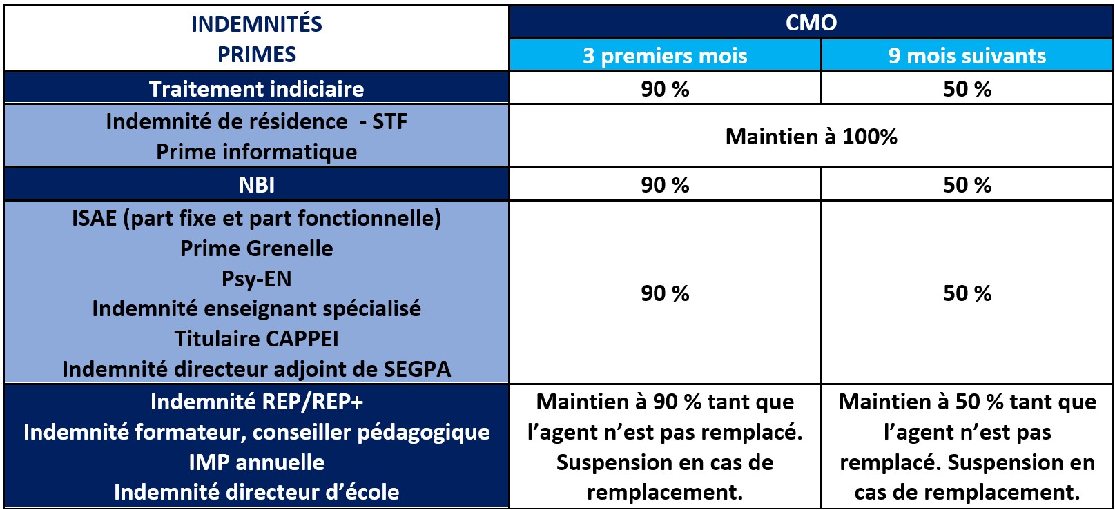 Depuis le 1er mars 2025, le traitement des PE en CMO est passé de 100 % à 90 % de la rémunération (indemnités incluses) durant les trois premiers mois du congé, puis à 50% de traitement pendant 9 mois (270 jours), que le CMO soit continu ou fractionné. Ces droits sont décomptés selon les arrêts déjà pris sur les 12 mois précédents.