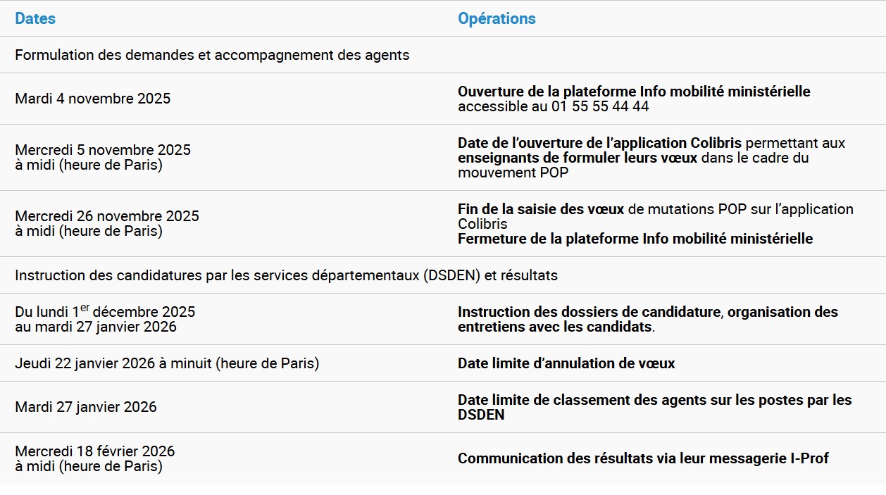 À noter : les PE affectés sur des POP au titre des campagnes 2023 et 2024 ne peuvent pas participer au mouvement interdépartemental 2025, car la durée minimale d’occupation d’un POP est de 3 ans. L’acception d’un poste POP annule automatiquement la participation au mouvement interdépartemental.