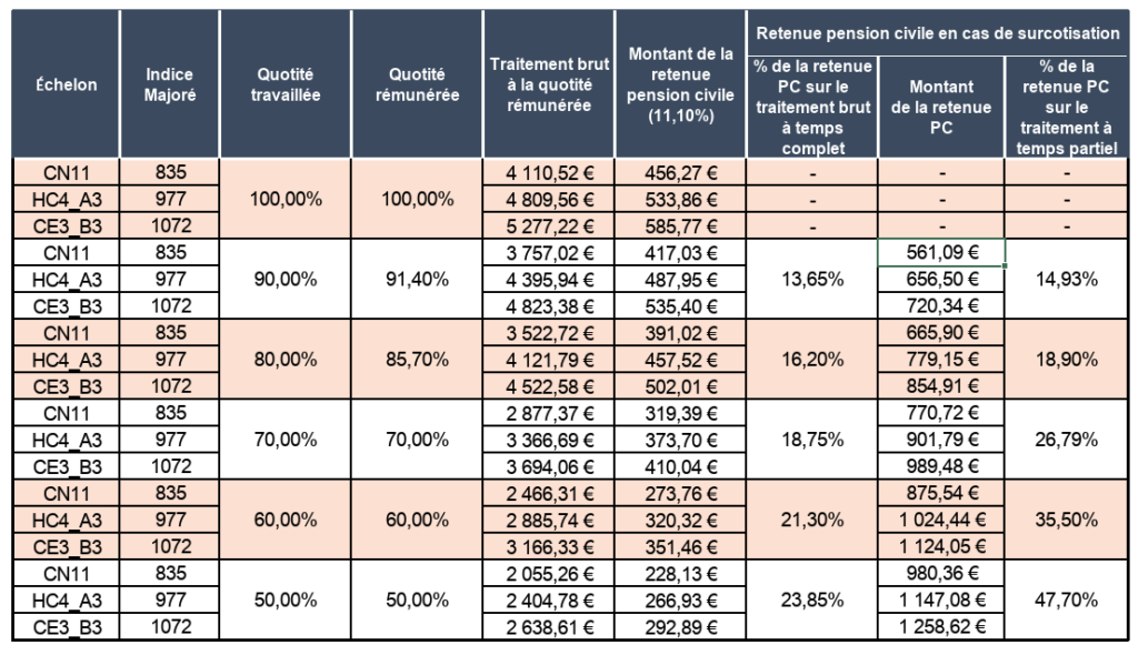 Voici des exemples du montant de la retenue pension civile, c’est-à-dire la cotisation prélevée pour financer le régime de retraite de l’État, pour des professeurs agrégés en fin de carrière aux derniers échelons de la classe normale, de la hors classe et de la classe exceptionnelle, en fonction de diverses quotités de service travaillées et en cas de surcotisation. Il faut noter la proportion de la retenue sur le traitement effectivement perçu à temps partiel.